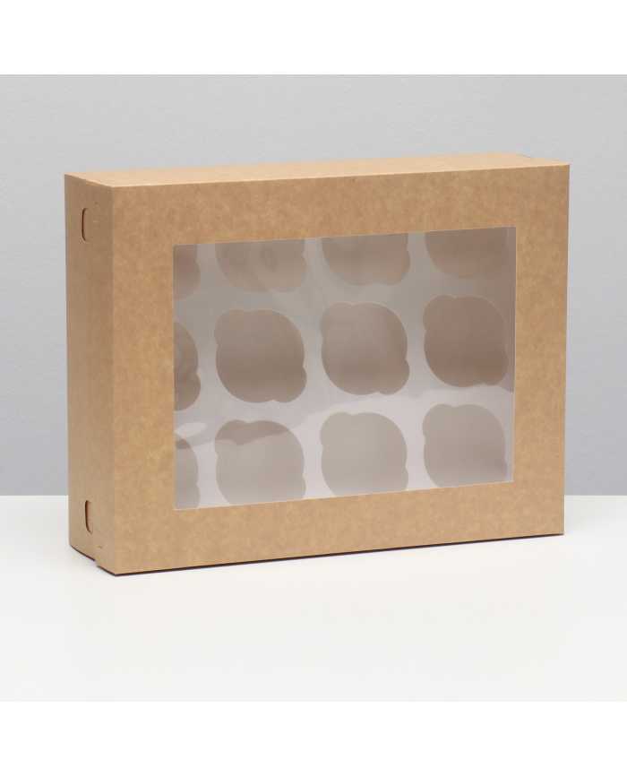 Коробка 23х31х10 см, на 12 капкейков, с окном, крафт